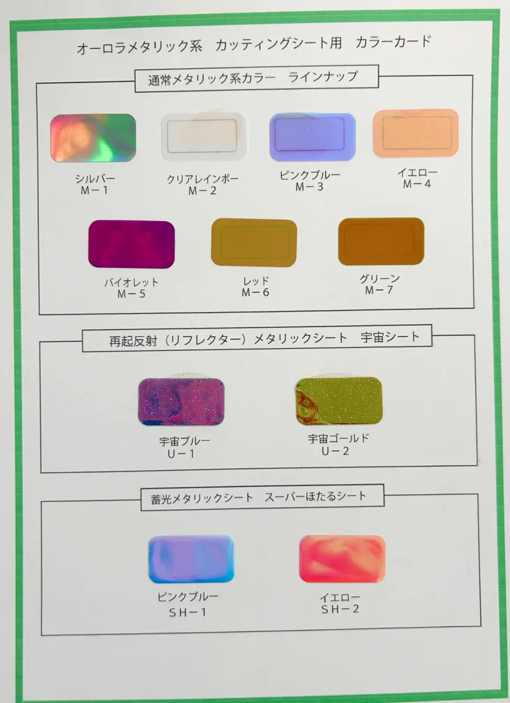 国内一般流通の2色に加え、通常オーロラカラー5色+機能付きオーロラカラー4色を含む、全11色に対応しています。 - カッティングシート仕様で手軽に製作可能