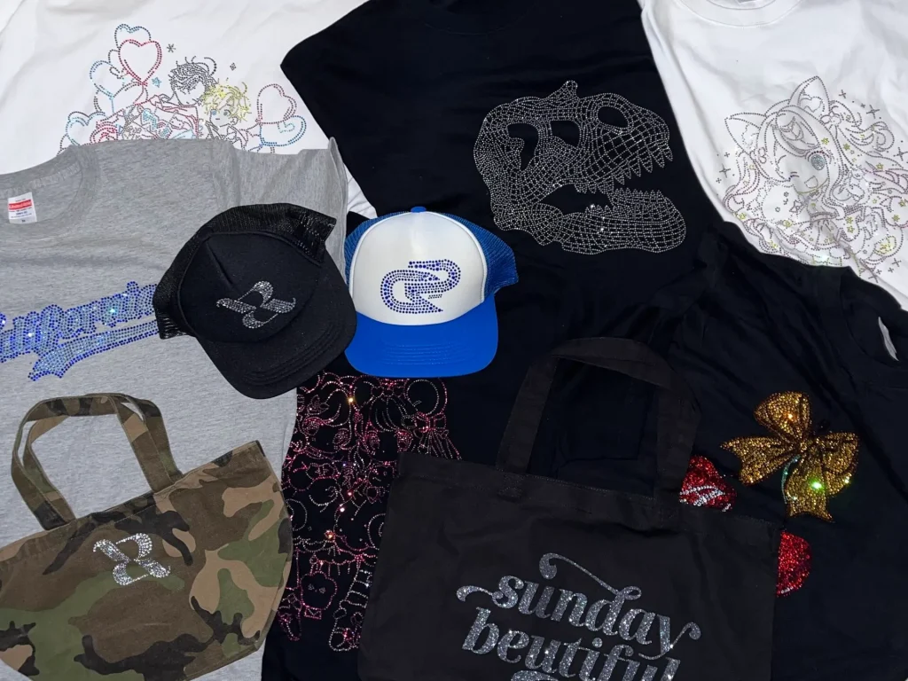 ベーシックな刺繍やプリントに加え、ラインストーンや箔押し、立体刺繍などを組み合わせることで、他社にはない表現が可能になります。とくにラインストーンは視認性が高く、Tシャツやバッグなどのカジュアルアイテムでも高級感を演出できるため、売れ筋のアクセントとして人気です。また、多色の糸を使った刺繍や、糸の光沢感を活かしたデザインなど、素材選びと縫い方の工夫で多様な表現ができます。これらの特殊加工に対応できる業者は限られるため、実績やサンプルを確認することが重要です。